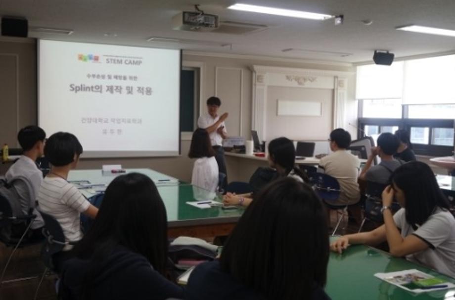 건양대학교(총장 김희수) STEM 특성화사업단(CK-1)은 27일 오후 대전 메디컬캠퍼스 명곡의학관 해부학교실과 보건학관 강의실에서 재학생 20명과 대전충청지역 고등학생 40명이 참가한 가운데 ‘STEM Camp’ 프로그램을 진행했다고 밝혔다. 이날 작업치료학과는 상지손상의 예방과 중재를 위한 스플린트의 제작과 적용이라는 주제를 camp 행사를 진행하였다. 참여한 고등학생들은 특수 플라스틱을 활용하여 직접 스플린트의 설계에서부터 제작까지 직접 체험해 보았다. 실제 작업치료사의 업무와 관련된 활동으로 참여한 고등학생들과 작업치료학과 재학생들은 흥미를 가지고 접할 수 있는 좋은 시간이었다.