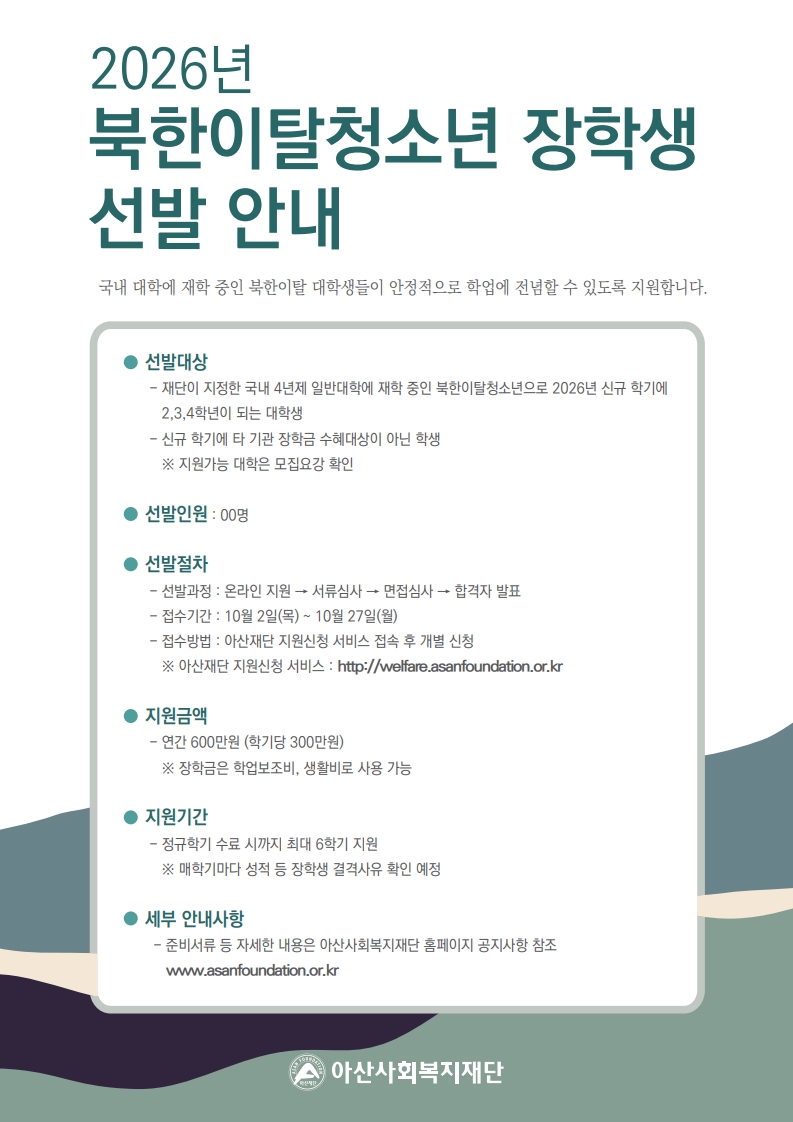제목 | 2026년 북한이탈청소년 장학생 선발안내 | ||||