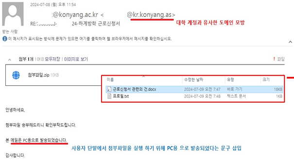 ▸ 우리대학 부서 및 사용자 계정과 유사한 도메인을 모방하여 실제 대학에서 수행 중인 프로그램이나 사업 등에 대한 내용을 포함한 메일을 사용자에게 발송 ▸ 사용자 단말(PC 환경)에서 첨부 파일을 실행하기 위해 PC용으로 발송되었다는 문구를 삽입하여 유포 ▸ 문서(hwp,docx) 파일로 위장한 바로가기 파일을 포함하고 있어 사용자가 해당 파일 열람을 위해 실행 시 악성코드 다운로드 및 설치 ▸ 해당 첨부 파일에 대해 교내 설치된 최신 백신을 통해 악성코드 탐지 및 치료 가능