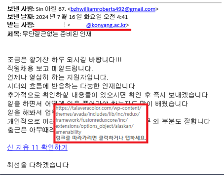 ▸ 입사 지원서 관련 내용으로 위장하여 채용 및 담당자에게 악성 메일 발송 ▸ 메일 본문에 하이퍼링크를 삽입하여 담당자가 해당 링크를 클릭하면 멀 웨어(악성코드)를 설치하여 사용자 단말 제어 및 고유식별정보 탈취 ▸ 링크 URL은 임의 경유지로 악용된 것으로 추정 □ 대응방법 ▸ 발신자 주소 및 도메인의 이상 유무 확인 및 발신자가 불분명한 이메일 열람 지양 ▸ 메일 내 외부 사이트 링크 주소 확인 → 개인정보나 계정 인증관련 메일이 수신되었을 경우 이메일에 포함된 링크 클릭을 지양 하고 정상 사이트를 직접 접속하여 확인 ▸ 메일 내 첨부 파일 실행 지양 → 발신자가 불분명한 메일 내 첨부 파일의 실행을 지양하고 다운로드 후 최신 백신을 통한 검사 필수 → 악성코드 유포 등으로 자주 악용되는 한글, 오피스, PDF 문서에 대한 최신 업데이트 적용 필수