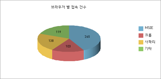 1. 디바이스 별 접속 건수 2. 브라우저 별 접속 건수 3. 기간 별 접속 건수 아직 2주밖에 지나지 않은 시점이지만 지속적으로 꾸준히 사용률이 증가하고 있다.