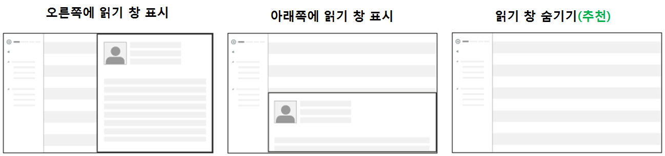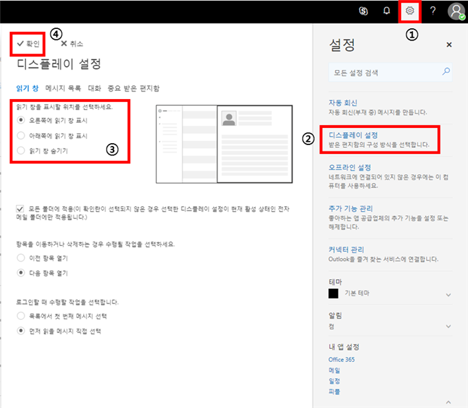 가. Outlook 상단의 [설정] 아이콘을 클릭합니다 나. [설정] 탭의 [디스플레이 설정] 항목을 클릭하여 창을 활성화 합니다 다. [디스플레이 설정] 창의 [읽기 창]을 선택하여 읽을 창을 표시할 위치를 선택 합니다. 라. 상단 [확인] 항목을 클릭하여 화면 설정을 마무리 합니다.