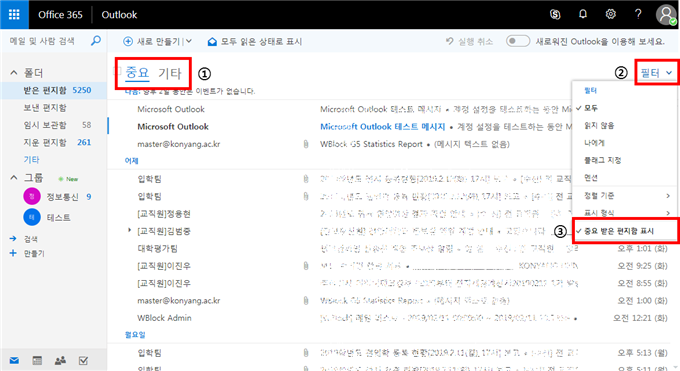 가. Outlook 화면의 받은편지함 구분이 [중요] / [기타] 로 구분되어 있는지 확인 합니다 나. 메일 목록 한눈에 보기 설정을 위해 상단의 [필터] 항목을 클릭합니다 다. 표시된 옵션 중 [중요 받은 편지함 표시] 항목의 체크를 해제 합니다 라. 아래 이미지와 같이 [받은 편지함]에 전체 메일이 표기 됩니다
