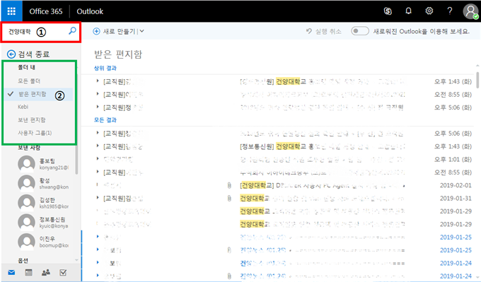 2. 편지 검색 방법 가. 오피스365(Outlook)은 키워드 기반 검색 기능을 제공합니다. 나. [받은 편지함] 상단 검색창에 키워드(제목, 내용, 보낸사람 이름, 보낸사람 주소 등)를 입력하여 검색을 진행 합니다 다. 좌측 검색참의 폴더 및 편지함을 선택하여 원하는 메일을 빠르게 확인할 수 있습니다.