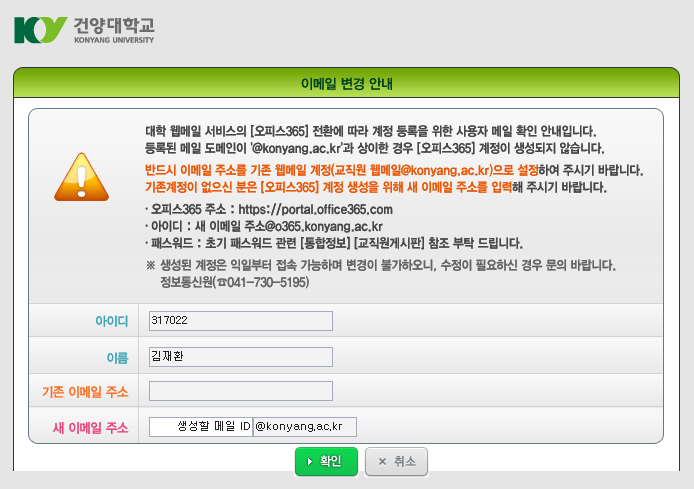 대학 신규 교직원의 메일 생성 및 사용방법을 안내 드립니다. 별도의 계정신청 없이 [스마트키] 로그인을 통하여 오피스365 메일 계정을 생성할 수 있습니다. 1. 건양대학교 SMART KEY 로그인 2. [새 이메일 주소] 항목에 생성할 메일 계정을 입력 후 [확인] 버튼을 클릭합니다