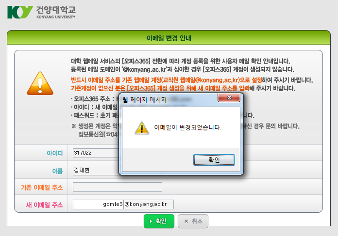 3. 이메일 변경 완료 메시지를 확인 합니다.