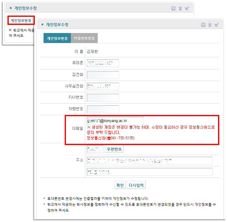 4. 포털시스템 화면의 [개인정보수정] 메뉴의 [개인정보변경] 아이콘을 클릭하여 ‘이메일’ 주소가 정상적으로 입력되었는지 확인 하여 등록을 완료합니다. ※ 등록된 계정은 익일 부터 사용 가능하며 계정관련 문의는 [정보통신원]으로 진행 부탁드립니다.