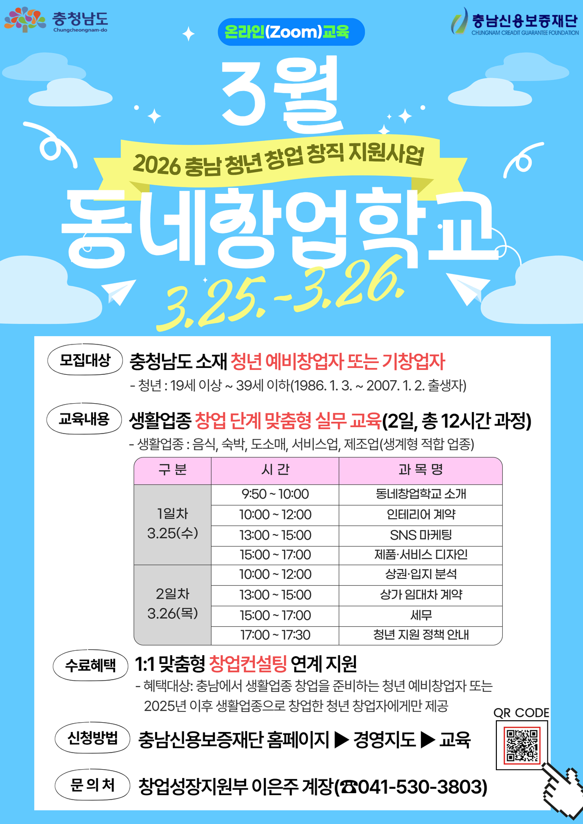 | 제목 | 2026년 3월,4월 동네창업학교 교육생 모집 공고 안내 | ||||