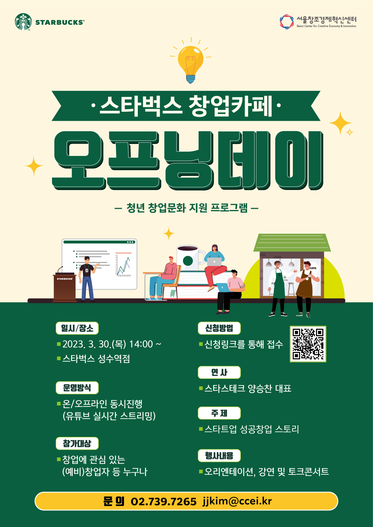 2023년 스타벅스 창업카페 오프닝데이 ○ 모집개요 - 스타트업 창업에 관심있는 업계 관계자, 일반인 및 예비/초기창업자 대상으로 "스타스테크" 양승찬 대표님의 창업 사례 강연이 진행될 예정이오니 많은 지원과 관심 바랍니다.