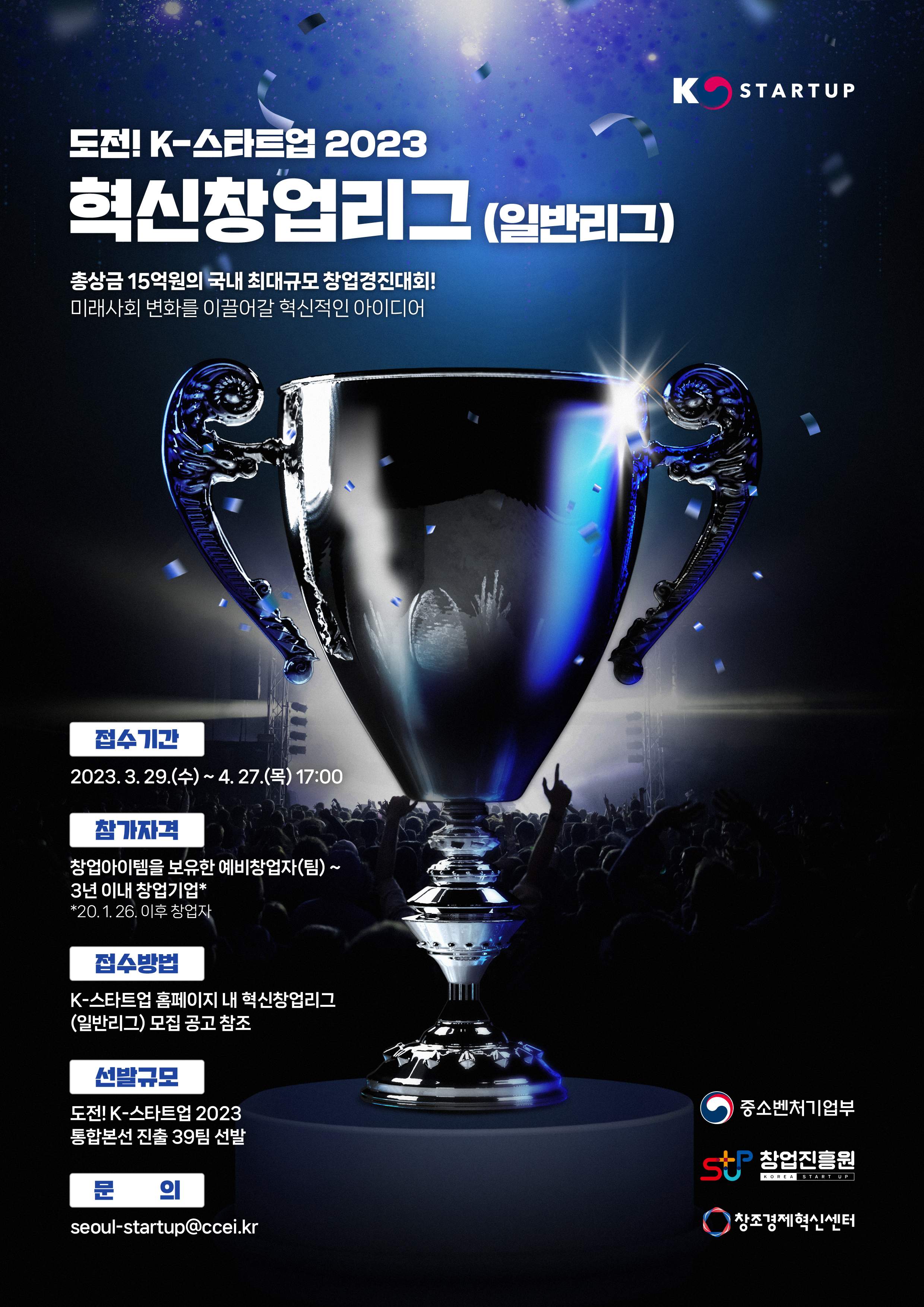 | 제목 | 도전 K-스타트업 2023 혁신창업리그(일반리그)참가자 모집(~4.27) | ||||
