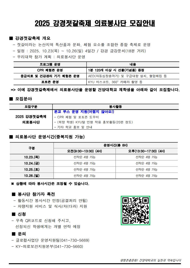 | 제목 | 2025 강경젓갈축제 의료봉사단 모집안내(2025.10.23.~10.26.) | ||||
