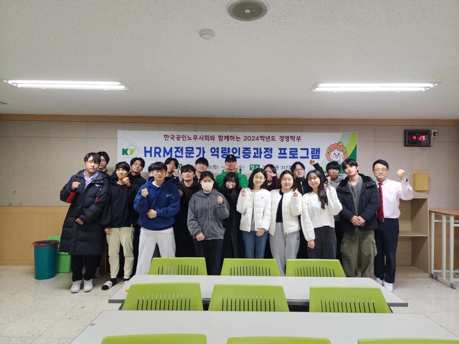 이번 2024학년도 경영학부 HRM 전문가 역량 인증 과정이 여러분의 뜨거운 관심과 참여 속에 성공적으로 마무리되었습니다! 경영학부 HRM 과정은 한국공인노무사와 함께 전문가로서 필요한 모든 역량을 키울 수 있는 알찬 내용으로 구성되어 있습니다. ?한국공인노무사가 알려주는 실무 경험과 노하우!! 수강생분들은 이번 과정을 통해 HRM에 대한 이해와 역량을 한층 더 높이고, 향후 취업이나 경력 개발에 큰 도움이 될 것으로 기대됩니다.